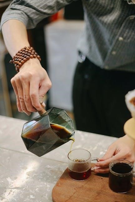 To prepare the enema solution‚ start by brewing 4 cups of distilled or filtered water with 4 tablespoons of organic‚ medium-roast coffee. Bring the water to a boil‚ add the coffee grounds‚ and let it brew for 5 minutes. Allow the solution to cool to body temperature (around 98.6°F)‚ testing it with your finger or a thermometer. If using a concentrate‚ mix 8 fl oz of coffee concentrate with 8 fl oz of hot water‚ then add cool filtered water to reach 32 fl oz. Ensure the solution is not too hot or cold before transferring it to the enema bag. For first-time users‚ start with 1 teaspoon of coffee to avoid sensitivity. Always use clean‚ organic ingredients for safety and effectiveness.